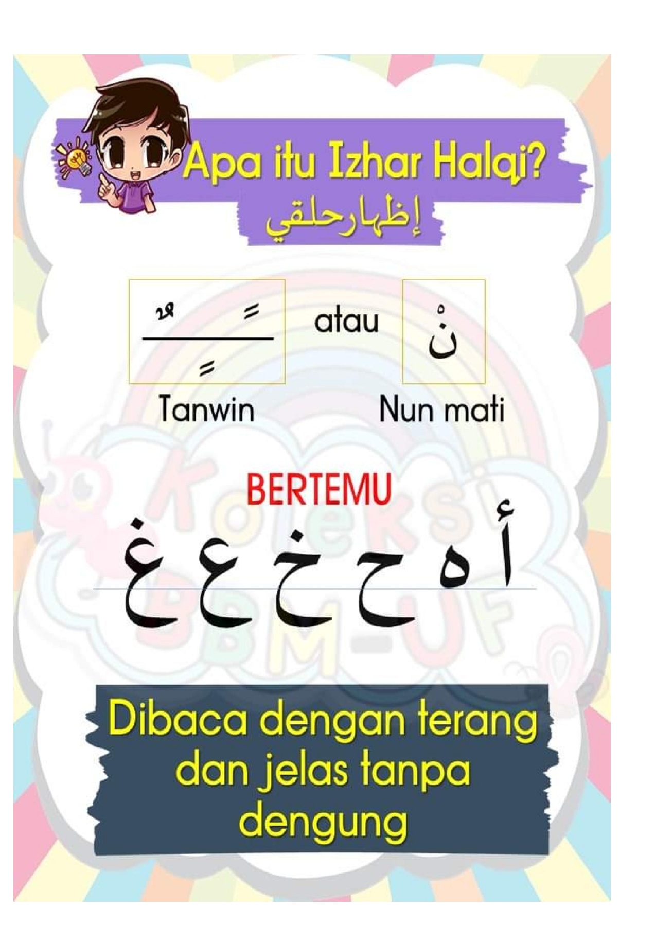 Tiada tanda sukun di atas nun sakinah dan tanda tanwin yang tidak selari. ء ه ع ح غ خ maka cara bacaannya adalah dengan menjelaskan sebutan huruf nun mati atau tanwin tersebut. Izhar halqi PILIH JAWAPAN YANG BETUL ID.